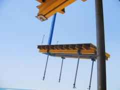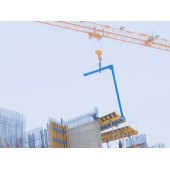 托架用于吊装台模单元,使用时要确保销子都插入相应的位置,托架的额定载重量是 1t,托架专门用来吊装台模单元,不得吊装其他工具和设备。两个叉子应叉入主梁之间以确保台模单元的稳定,如果不方便叉入主梁之间时,也可直接托住主梁,使台模横向放置, 但这种情况应尽量避免。
