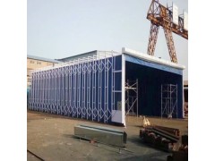 1、轨道:采用轻型地轨作为伸缩移动轨道。轨道的起始端和终止端特置,移动框架室体:由移动龙门架结构、伸缩房体支架、伸缩控制连杆、房体密封布等组成。