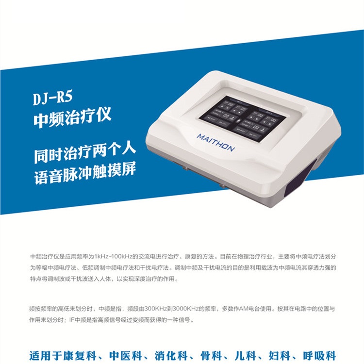 中频电治疗仪治疗原理,将两组及以上不同频率电流交叉输入人体,在体内互相干扰产生差频电流,可以起到镇痛、兴奋神经肌肉组织、促进局部血液和淋巴循环、软化瘢痕、松懈黏连、提高平滑肌肌力等作用。