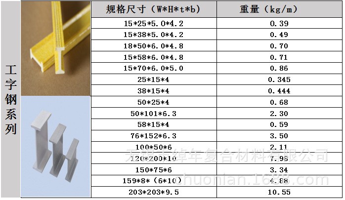 玻璃钢工字钢是由无碱无捻玻璃纤维合股粗纱,并浸以聚酯树脂或环氧树脂连续引拔成型、加热固化而成,具有较高的机械性能和介点性能,并且按照不同模具可以制成各种大小满足用户不同需要。