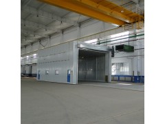 整体移动式喷漆间的设计目的,是为了满足较大型工件 打磨或喷漆的需要。一般情况下每套房体对应2~3个排风净化工位,哪个工位上的工件需要喷漆时,房体则行走移动到那个工位,其他工位可以继续打磨工作,待 房体内的工件喷漆完毕后,再控制移动房体行走到打磨完毕后的工件工位,如此设计可以实现大型工件的不间断连续喷漆工作。房体为钢结构构造,房体立柱下面设置有两台电动驱动行走机构,行走机构沿地面轨道行走。移动房体两端设置有电动卷帘大门,房体行走时,大门升起,待到达位置时,大门降落关闭。大门与行走机构由电气控制部分连锁控制,大门升起后,房体才可移动行走。