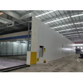 整体移动喷漆房的设计目的是为了满足磨削或喷涂较大工件的需要。一般每套对应2-3个排气净化站。当哪个工位上的工件需要喷漆时,房间移动到那个工位,其他工位可以继续抛光。当室内的工件涂漆后,控制移动室移动到抛光工件工位。这种设计可以实现大型工件的不间断连续涂装。房屋为钢结构,房屋的立柱下有两个电动行走机构,行走机构沿地面轨道行走。移动房两端安装电动卷帘门。当房间行走时,门上升,当房间到达位置时,门着陆并关闭。门和行走机构由电气控制部分连锁控制。门升起后,房间可以移动和行走。