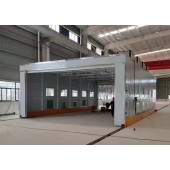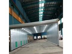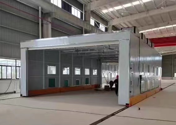 一般每套对应2-3个排气净化站。当哪个工位上的工件需要喷漆时,房间移动到那个工位,其他工位可以继续抛光。当室内的工件涂漆后,控制移动室移动到抛光工件工位。这种设计可以实现大型工件的不间断连续涂装。房屋为钢结构,房屋的立柱下有两个电动行走机构,行走机构沿地面轨道行走。移动房两端安装电动卷帘门。当房间行走时,门上升,当房间到达位置时,门着陆并关闭。门和行走机构由电气控制部分连锁控制。门升起后,房间可以移动和行走。