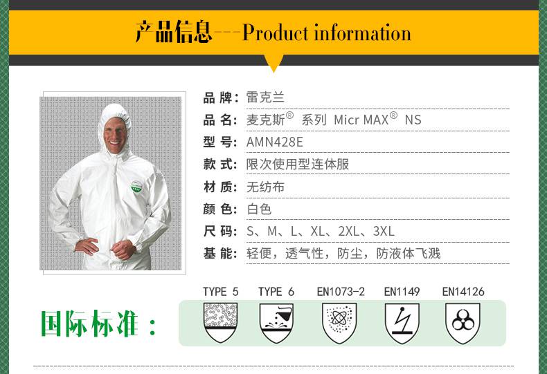 产品名称:雷克兰 麦克斯 AMN428E 标准款 防尘 防液体飞溅防护服