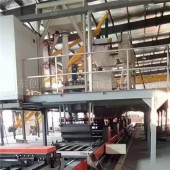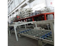 该机采用双驱动对辊挤压工艺,产品从上浆、主料、铺布、复合、复压一次性完成正版的生产过程,设备自动化程度高,运行平稳,规格任意调整。产品表面平整,光滑,密实度高,真正实现了新型建筑墙体板材的工业化流水线生产。大大降低了生产工人的劳动强度。彻底改变了以往的立模,平模浇注成型的诸多弊端。如:模具的使用量大,周转率低;需电加热或蒸汽加热;产品种类单一;隔声,保温效果不能满足市场要求等诸多缺陷。