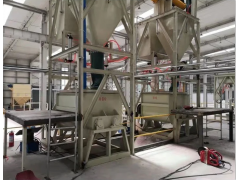 设备特点:1、自动化程度高:整条生产线采用PLC电脑自动化控制,实现了自动上模板、自动涂脱模剂、自动配料、自动上浆、自动铺布、自动摊平、自动分切、自动复压、自动接板等自动化功能。