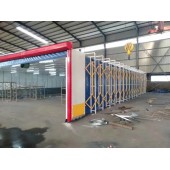 喷漆房后部采用防火岩棉夹芯板(可更换为镀锌板制作)作为底板,并合理设置多个吸风口,喷漆房内漆雾能有效进入后道废气处理装置。伸缩式喷漆房采用活动式框架结构,内衬玻璃纤维防火篷布,通过进出口门头处的驱动电机,通过轨道带动整体结构进行伸缩运动;非工作时间可将喷漆房整体折叠,节省了车间场地,作业时根据实际情况调节入口处卷帘,控制补风,从而提高作业时产生漆雾的回收效果。