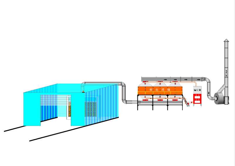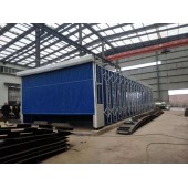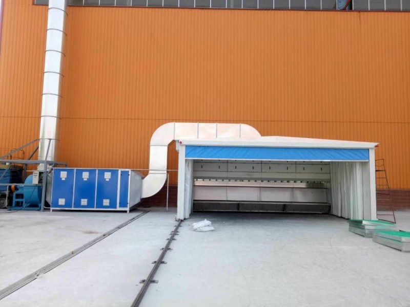 喷漆房后部采用防火岩棉夹芯板(可更换为镀锌板制作)作为底板,并合理设置多个吸风口,喷漆房内漆雾能有效进入后道废气处理装置。伸缩式喷漆房采用活动式框架结构,内衬玻璃纤维防火篷布,通过进出口门头处的驱动电机,通过轨道带动整体结构进行伸缩运动;非工作时间可将喷漆房整体折叠,节省了车间场地,作业时根据实际情况调节入口处卷帘,控制补风,从而提高作业时产生漆雾的回收效果。