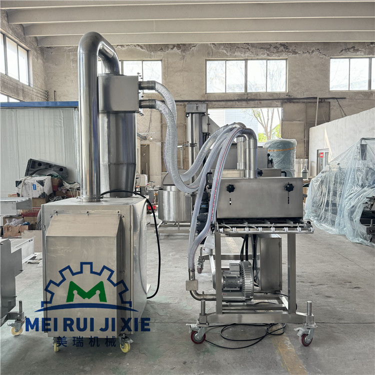 工作前,将干面包屑或雪花片加入储料仓内,启动输送网带,调节出粉口流量,要求覆盖整个输送网带的宽度,以保证产品裹涂均匀。待底粉均匀分布后,即可进行产品的裹粉操作。产品由输送网带送入撒粉区裹涂,然后经风刀吹去多余部分面包屑,就完成了裹糠过程。