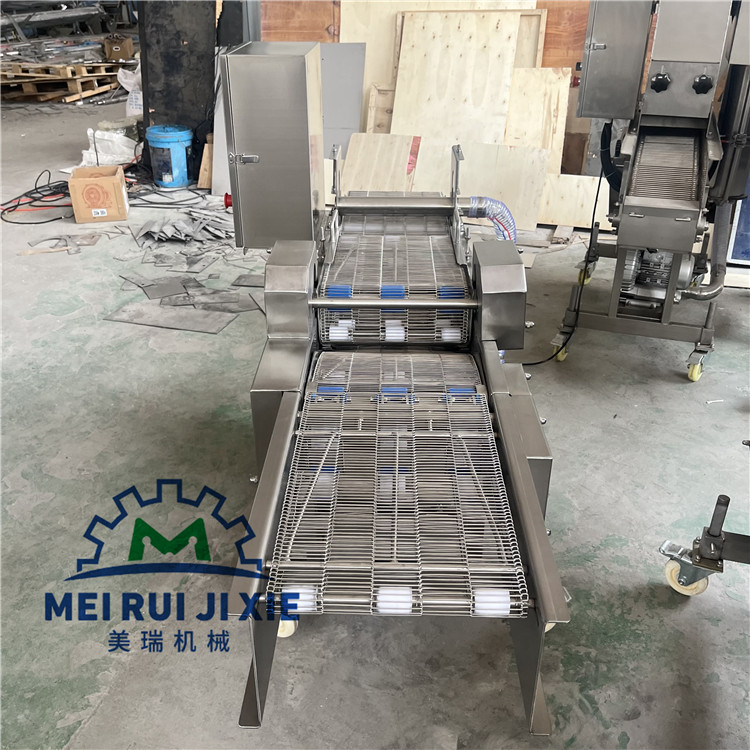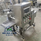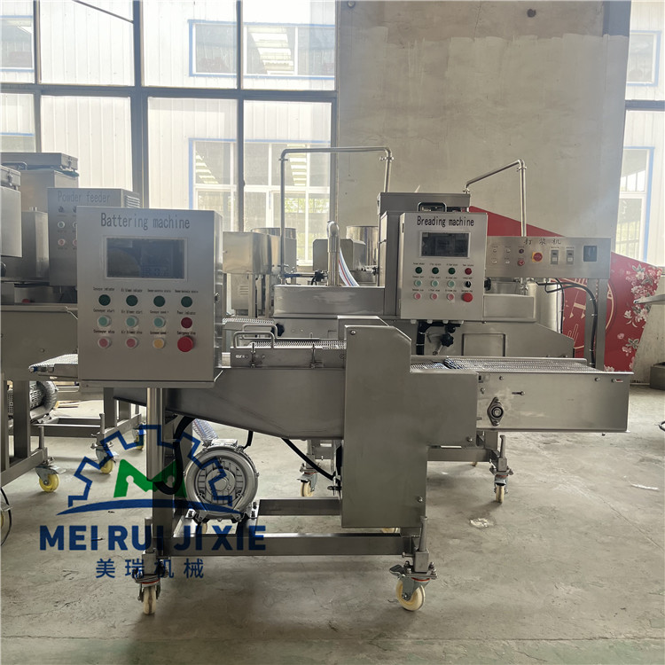 鸡排虾类上浆裹粉加工设备上浆机能自动完成上浆过程,稀浆、浓浆均可。产品经过上下网带,在浆液中沾满浆液,上浆后的产品经风淋,避免过多的浆料进入下道工序。上下网带间隙可调,产品适用范围广;强力风机去除多余浆料;操作、调整方便,可靠;具有可靠的安全防护装置;整机采用不锈钢制造,可拆卸,便于清洗。