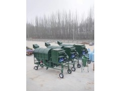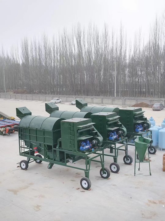 为收割做准备,稻谷清理筛已准备好接应工作。稻谷清理筛由两层筛网分隔为三层筛筒,每层筛筒依次设有大杂物出口,物料出口,小杂物出口。物料出口长度要长于其他两个出口。上层筛网的孔径大于物料孔径,下层筛网的孔径小于物料孔径,从而实现稻谷中的大小不一的杂质。