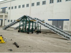 双翼升降输送机是在一般带式输送机的基础上,增设了双翼设计。两台可液压升降的输送机在两侧形成双翼式,中间有支撑台,输送水平倾角小于22,可以在这个角度范围内任意调节,方便在不同角度装卸车使用。这两部分可独立旋转的输送机,两部分输送机分别由液压油缸控制其升降,液压马达控制其旋转,并且可叠放在一起,尾部输送机动力来源于电动滚筒,头部输送机动力来源于电动机。底盘四角分别装有液压支撑腿,四轮转向角度范围大于10度,实现了整机横向和纵向行驶,配有方向盘式电动转向装置,可自动行走,移动方便。适用于各种复杂环境,例如集装箱装车,火车皮装车,探入式散粮装载以及人工难以施工的场所。