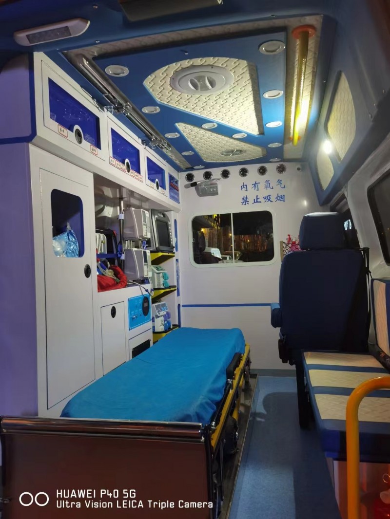 救护车上配备有各种急救设备和药品,确保病人在转运过程中的安全。