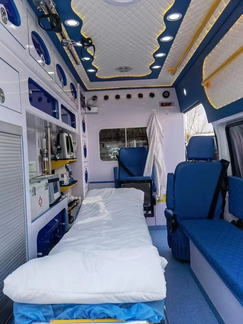 救护车上配备有各种急救设备和药品,确保病人在转运过程中的安全。