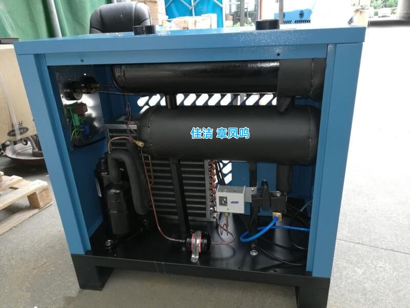 3、制冷控制元件均采用制冷元件,性能优良,具有热力膨胀阀的节流降压功能,热气旁通阀的能量调节功能,油分离器的冷冻油的油分保护功能,冷媒高低压控制器的冷媒高低压保护等功能。 4、气液分离采用旋风分离与不锈钢丝网捕雾有机结合的气液分离器,具有气液分离效果彻底,避免水份的二次蒸发,冷干机的干燥效果的重要作用。它比旋风分离器分离效果好得多,同时又比过滤式气液分离器使用成b低,具有较市制性能价格比。 5、设备结构设计合理,便于维护保养,箱式外形,美观大方。 6、无基础安装。 7、实时显示运行参数。