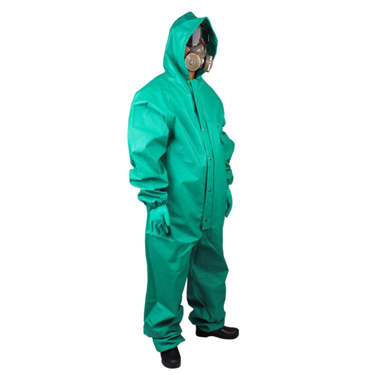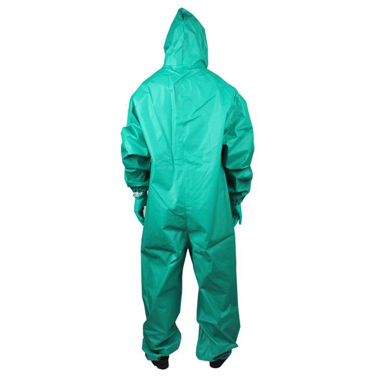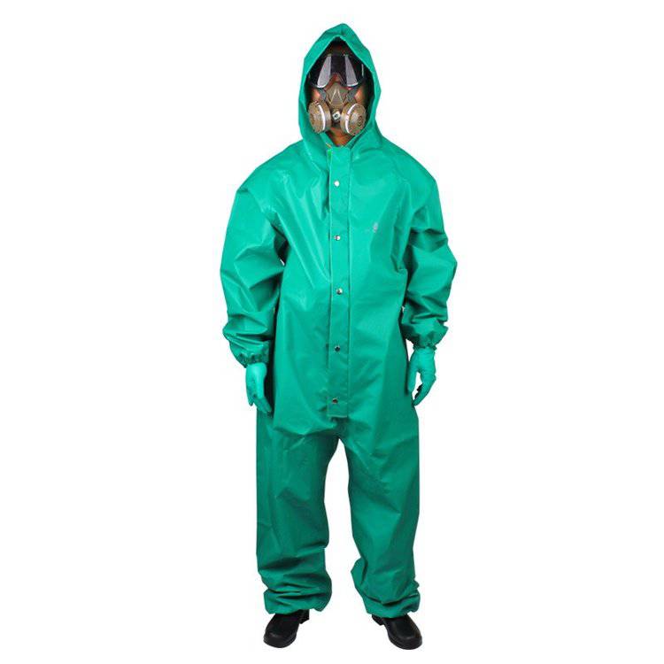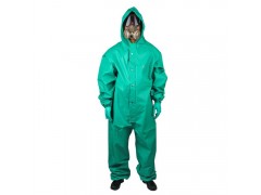 三级液密连体防化服PVC款,带兜帽,袖口和裤腿无弹性,按扣下配有拉链收紧,接缝处密封加固处理。