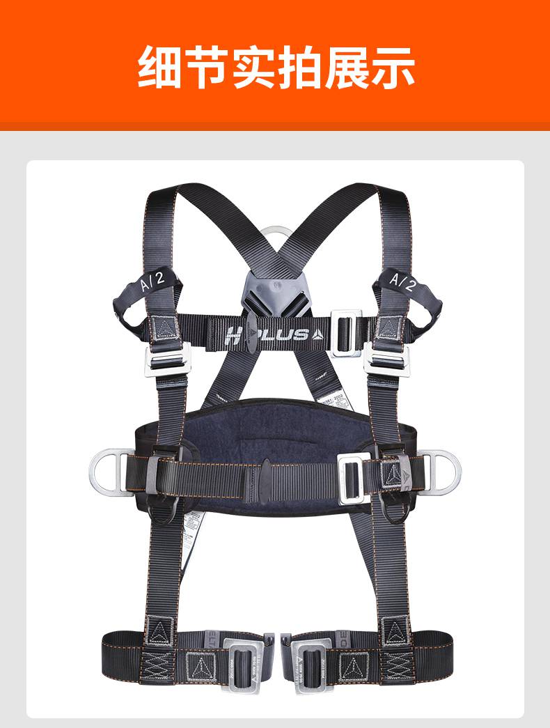 黑橙色横条高强度织带,左肩胛部配有下坠指示器,背部超大型连接环;