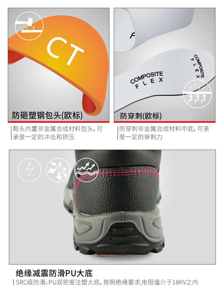 本产品具有防砸, 防刺穿功能,保护包头和防穿刺中底为非金属合成材料;
