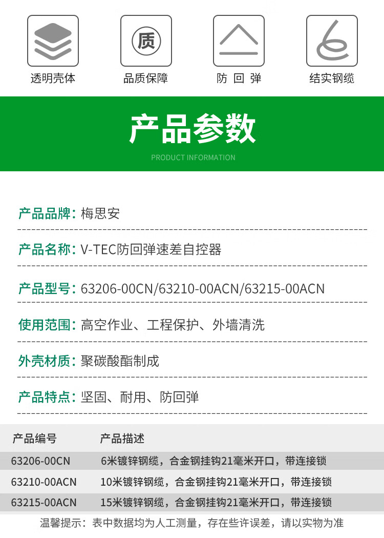 MSA/梅思安 63210-00ACN V-TEC 10米镀锌钢缆合金钢挂钩21毫米开口带连接锁速差器