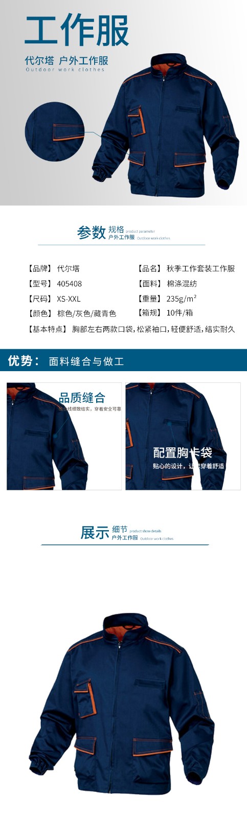 松紧袖口,配备胸卡袋,穿着轻便舒适,结实耐久。