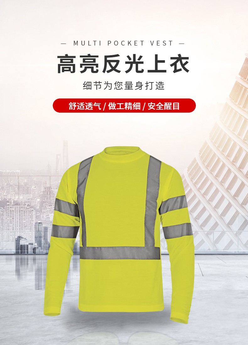 荧光可视工作服长袖T恤款,圆领。高可见性:等级3,肩部、腰腹及手臂处有银色反光条,适用于任何天气的室内外工作。