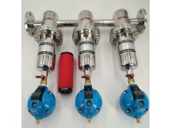 压缩空气精密过滤器的配置原则是:在干燥机前安装三支过滤器,在干燥机后端安装一支过滤器。为什么这么配置呢?因为过滤器分为很多级别,有P、U、H、S、C级别。级别不同过滤精度不同,P级过滤器过滤精度为3um,U级过滤器过滤精度为1um,H级过滤器过滤精度为0.01um,S级是0.001um,C级是活性炭过滤器。这四种过滤器都是安装在干燥机的前置,主要过滤液态水、尘埃、固体颗粒及其他杂质。H级过滤器过滤精度可以高达0.01um,由于过滤精度非常高,所以安装在干燥机后端过滤从干燥机里出来的压缩空气中夹杂的细小粉尘。