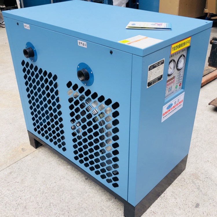 冷冻式干燥机是根据冷冻除湿原理,利y全f闭压缩式制冷系统,对经空压机排出的压缩气体冷却降温,使其中所含的大量饱和水蒸气、油雾凝结液滴,经过经气水分离后由自动排水器排出。较高温度的饱和压缩气体进入冷干机的预冷器,在预冷器中与来自蒸发器的干冷气体进行热交换,降低温度后进入制冷系统的蒸发器,与冷媒蒸汽进行d二次热交换,使本身温度降到接近于冷媒的蒸发温度,在两次降温过程中,压缩气体中的水蒸汽得以凝结成液态水滴并随气流进入气水分离器,分离下来的液态水经自动排水器排出机外,温度较低的干燥压缩气体进入预冷器,