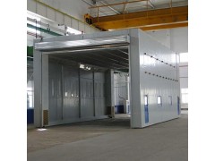 整体移动式喷漆间的设计目的,是为了满足较大型工件 打磨或喷漆的需要。一般情况下每套房体对应2~3个排风净化工位,哪个工位上的工件需要喷漆时,房体则行走移动到那个工位,其他工位可以继续打磨工作,待 房体内的工件喷漆完毕后,再控制移动房体行走到打磨完毕后的工件工位,如此设计可以实现大型工件的不间断连续喷漆工作。房体为钢结构构造,房体立柱下面设置有两台电动驱动行走机构,行走机构沿地面轨道行走。移动房体两端设置有电动卷帘大门,房体行走时,大门升起,待到达位置时,大门降落关闭。大门与行走机构由电气控制部分连锁控制,大门完全升起后,房体才可移动行走。