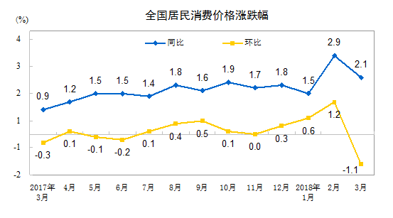 3月份,全国居民消费价格环比下降1.1%。其中,城市下降1.1%,农村下降1.2%;食品价格下降4.2%,非食品价格下降0.4%;消费品价格下降1.4%,服务价格下降0.7%。