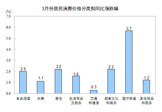 其他七大类价格同比均上涨。其中,医疗保健、居住、教育文化和娱乐价格分别上涨5.7%、2.2%和2.2%,生活用品及服务、其他用品和服务价格分别上涨1.6%和1.2%,衣着、交通和通信价格分别上涨1.1%和0.3%。