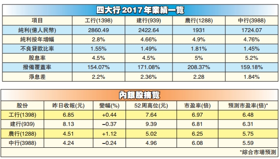 不良贷款是另一个影响内银股盈利的因素,四大行去年的不良贷款率均有所回落,反映内地金融去槓桿政策有一定成效,银行资产质素正在改善,估计今年的不良贷款额或可维持在低单位数增长,甚至有所回落。四大行的管理层在业绩發布会上也大派定心丸,指有信心今年的不良贷款率趋向稳中有降,维持在合理水平。