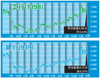 至於投资者最关心的股息率,去年内银股平均息率仅3.9%,但四大行则维持4.5%至5.2%的较高水平,彭博预测的数字显示,四大行今年的预测息率会由4.9%至5.6%不等。