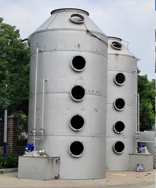 酸碱洗涤塔的工作原理是根据酸碱中和一般处理比较容易溶于水的化学物质.,采用氢氧化钠等吸收中和液来净化酸雾废气。酸碱废气由风管引出后,进入废气中和处理塔,向上流动至滤料层,与喷嘴喷出的中和液接触反应。吸收后的废气继续向上流动至第二滤料层,与第二级喷嘴喷出的中和液接触,再次发生中和反应,然后通过旋流板,由风帽和排风管或风机排出,进行净化处理。塔内添加一定的填料,这样可以使得废气和洗涤液充分接触,从塔上流下来的洗涤液再通过水泵提升 至塔顶,不断循环使用,待循环洗涤液达到一定浓度后再排向污水处理站。