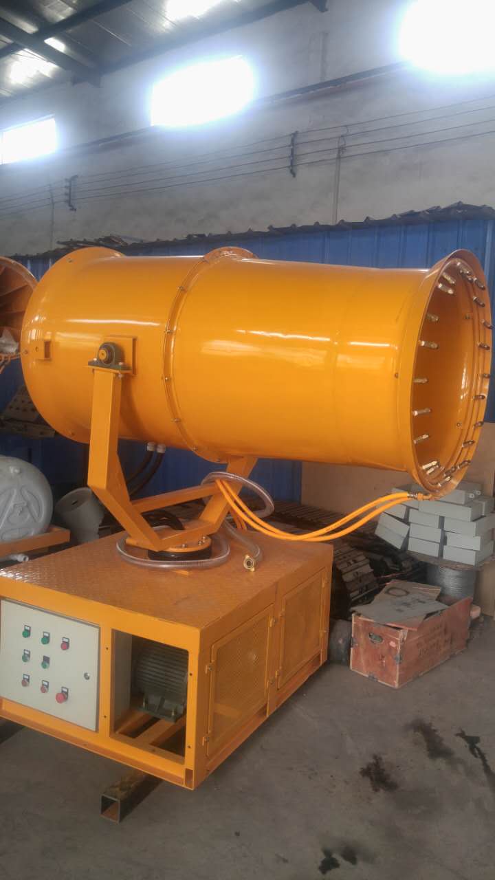 喷雾炮是根据风送,先使用进口高压泵、微细雾化喷嘴将水雾化,再利用风机风量和风压将雾化后的水雾送到较远距离,使得水雾到达较远距离同时能够覆盖更大面积,水雾与粉尘凝结后降落,从而达到降尘目的。