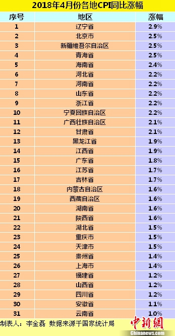 图为各地2018年4月份CPI同比涨幅。