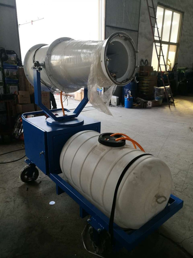操作简单方便;3.自动控制,使用安全可靠,可随意调节喷雾俯仰角度和水平旋转角度。 4.手动兼遥控控制使用、灵活方便。 5.超大水箱容量,可装800L水,持续喷雾25分钟 6.使用范围广、工作效率高、喷雾速度快,对尘埃有较强的穿透力和雾珠附着力,能有效地节约用水和减少环境污染。 7.射程远,覆盖面积大,最远射程水雾可达100米远(可定制),通过高压将水雾化成粉尘大小相当的水珠,在风机作用下将水雾精准抛射至目标,对扬尘具有很好的控制能力,降尘效果达95%-99%。