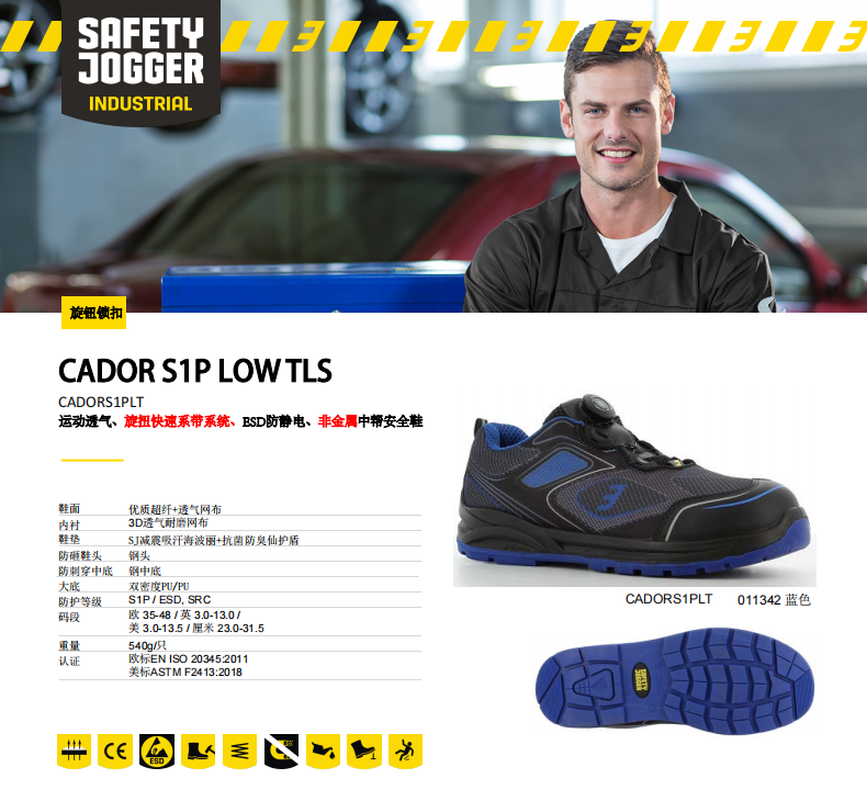 产品名称:鞍琸宜 CADOR S1P LOW TLS 011342 防砸防刺ESD防静电 智能旋钮扣 安全鞋