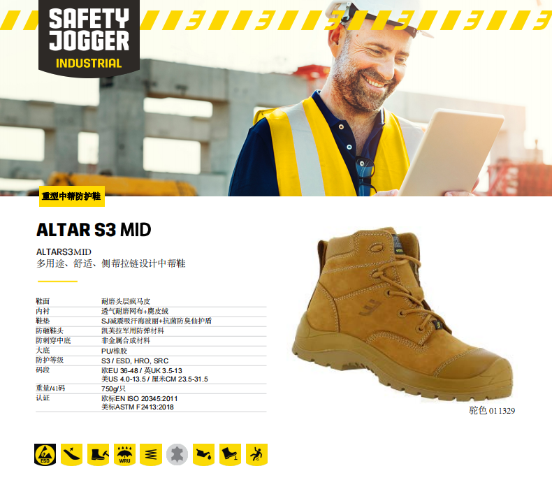 产品名称:Safety Jogger/鞍琸宜 011329 防砸防刺防静电 驼色重型中帮安全鞋