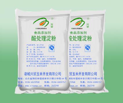 白色或类白色粉末,无臭、无味,较易溶于冷水,约75℃开始糊化。同浓度的酸改良性淀粉的淀粉糊的黏度低于同类原淀粉相应的黏度。浓度超过10g/100 mL的糊化液经冷却可形成凝胶态。酸处理淀粉