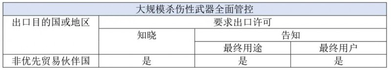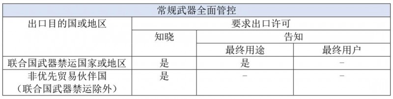 除上述物项外,用于武器和两用物项相关的技术和货物都属于全面管控的物项(食品和木材除外)。当出口时,出口经营者需要依据最终用户和最终用途申领出口许可。