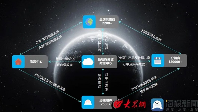 在新明辉的“数字王国”里,以新明辉商城为支撑,供应商、分销商、物流中心和终端用户构成了一个数字供应链服务平台,借助自主研发的系统,新明辉为供应链上游提供实时的需求信息和方向,及时反馈市场数据,指导上游供应商正确定位自研产品和市场选择;为供应链下游客户提供实时的商品信息和库存共享,帮助下游客户节约资源,优化管理。客户可以用电脑端、手机端App、微信小程序等方式登录新明辉商城,在进行比价后选择自己想要的产品,客户可通过系统实时查看产品的库存、订单状态,下单后系统在2分钟内即可完成配单并将信息传至仓库安排发货,极大地节约了时间成本,促进行业的集约化。
