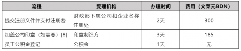 表1 文莱公司注册程序及成本