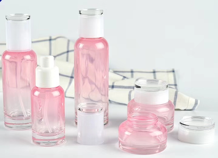 化妆品套装瓶喷色工厂 化妆品瓶印字厂化妆品瓶型设计方案种类有玻璃瓶子、管制瓶、化妆品空瓶子、精油瓶,膏霜瓶,保湿乳液瓶等护肤品玻璃瓶。化妆品瓶型设计一般是根据设计方案、出模、试件、生产制造、蒙砂、打磨抛光、喷漆、高低温试验纯色及混色印刷工艺的一个生产工艺流程。