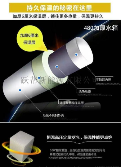 不锈钢强力支架:全机不锈钢加宽加厚支架,杜绝生锈,加配防风脚,台风来了也不怕。水箱加厚保温层,持久保温,进口聚氨酯一体发泡保温层。防腐蚀不生绣,304食品级不锈钢内胆,SUS-304B食品级不锈钢。超长质保经久耐用