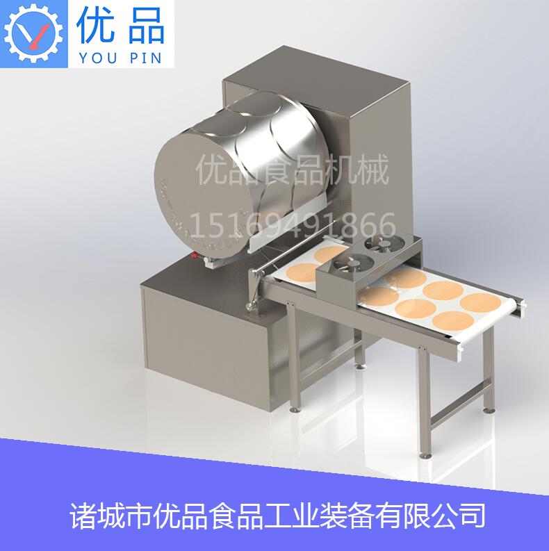 新型烤鸭饼机(卷卷皮机 薄饼机)增加面浆循环功能,自动回流免去频繁接上浆工作。适用于各种形状的春卷皮、烤鸭饼、单饼、蛋卷皮、咖喱角皮、荷叶饼、法国薄饼皮的制作。面浆直接产出成品,替代传统人工烤鸭饼高温低效率劳作,生产效率极高,每小时可达1500-2500张,适用于食品厂、饭店、快餐店、面饼批发商等。 该设备能自动完成面皮的送料、成型、熟制、输出、降温等工序,可以与下馅机,油炸机,速冻机,包装机等组成全自动熟食生产线。面皮大小与形状可根据客户定制。
