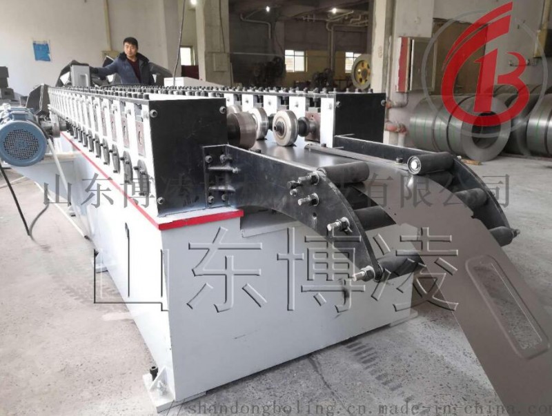 该机组设备占地约50平方米,设备组成主要包括:放料装置、校平装置、自动送料装置、连续冲孔装置、高精度冷弯成型主机、定尺切断装置、自动折框装置、电气控制系统等部件组成;主要功能:自动去角、伺服自动冲孔、自动下料、自动成型、自动折框等。