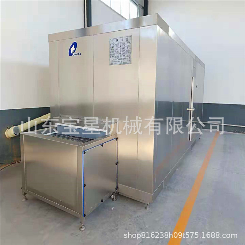 宝星机械隧道式速冻机由进料口、保温库体、出料口、传动系统、循环风系统、蒸发器、冷源系统、电控系统等组成。