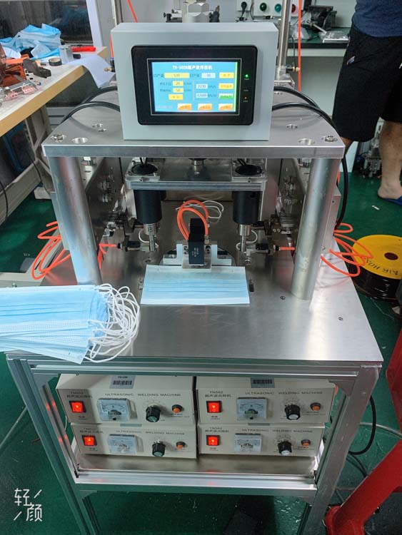 半自动顾名思义还是需要每台设备配一个人员操作,把口罩片一 一 放入机器中,实现自动焊接完成,采用四点同时焊接结构,超声波焊接技术,完成口罩耳带的焊接,优点是生产效率比手动的要高出一倍,性能相对于比较稳定,随着技术越来越成熟,一次性投入成本也不低。