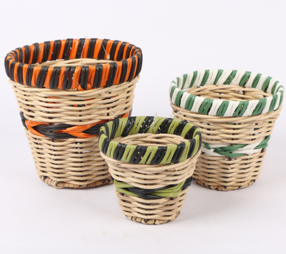 加工定制自然色藤心黑色橘红色皮管混编圆形直筒筐