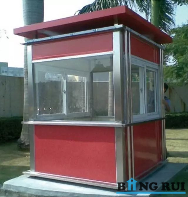 易顺岗亭主架采用80*80*3.0mm钢架结构,40*60*2.0方管支架。 四面板采用双层聚氨酯保温材料,两层12mm厚木板,外板采用2mm厚复合铝板制作,内板采用2mm厚铝板固定。